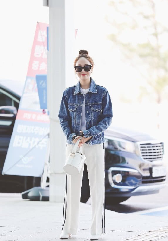 鄭秀妍身穿一件白色T恤,外面搭配上一件牛仔外套,小袖子恰到好處地遮擋住了手臂上的小肉肉,下身是一條白色的闊腿褲,手上拎着一個白色的包包,整體的搭配以休閑為主。