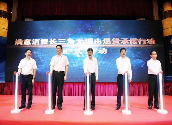 9月26日,長三角“三省一市”市場監管局相關負責人在浙江嘉善共同啟動長三角地區企業無理由退貨承諾行動。鄭鐵峰攝