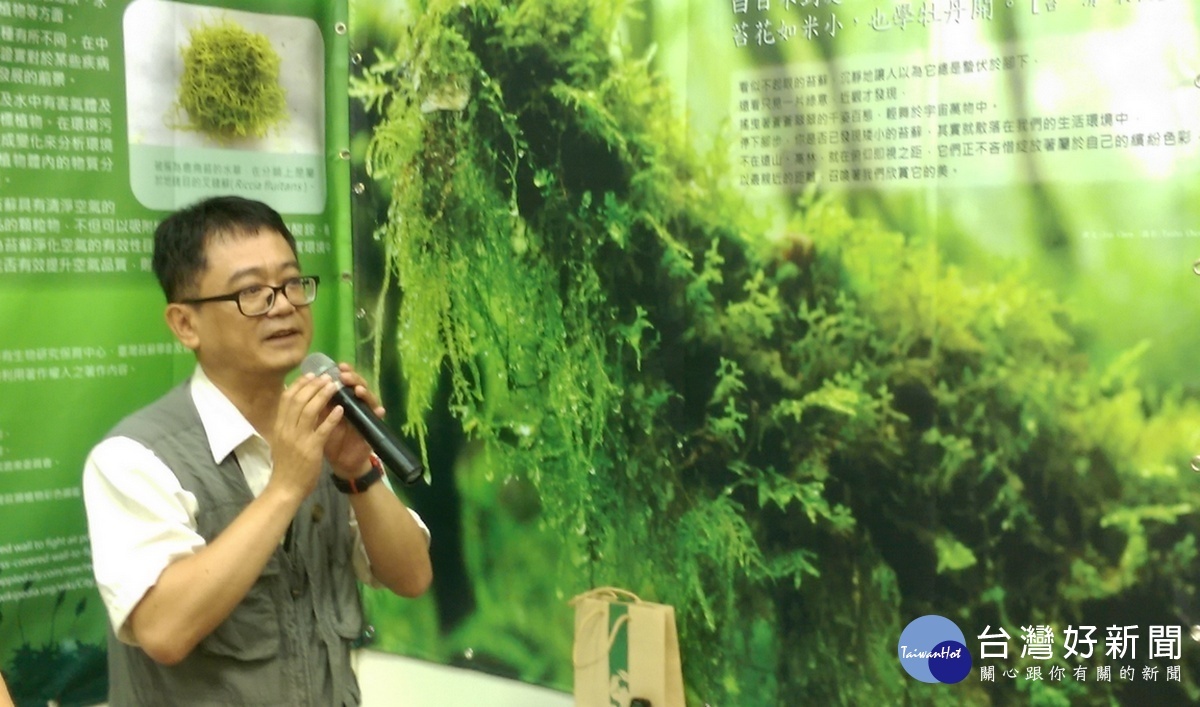 特生中心主任楊嘉棟為與會來賓導覽講解苔蘚之美。〈記者吳素珍攝〉