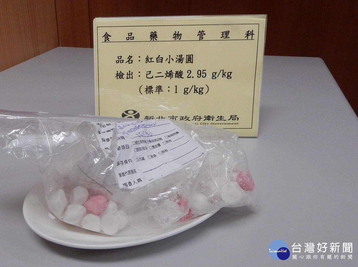 新北市衛生局抽驗冬至湯圓、火鍋料、生鮮蔬菜及肉品等58件應景食材,其中有1件湯圓檢出防腐劑「已二烯酸 2.96 g/kg(標準:1 g/kg)」超標,已依違反食安法第18條裁處新臺幣3萬元罰鍰。
