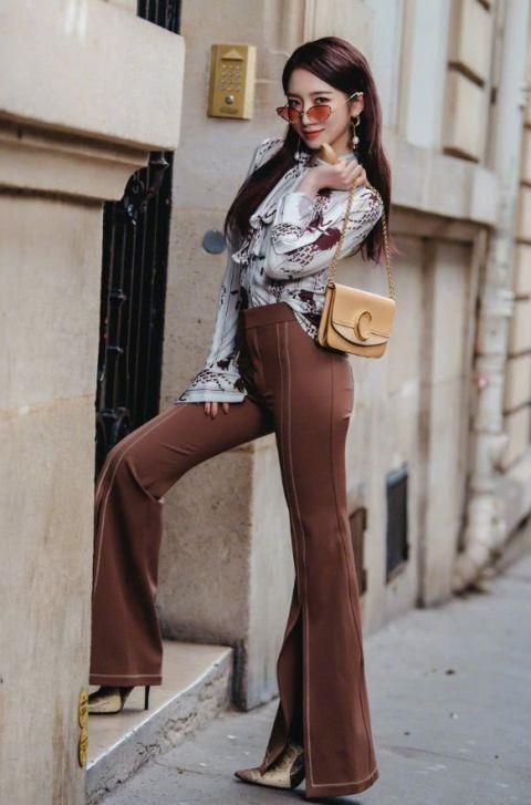 孟美岐不適合街拍?她穿了一件白色的雪紡衫,上面布滿了酒紅色的花紋,襯衫的袖口有開叉設計,顯出幾分瀟洒感。孟美岐在下面搭配一條巧克力色的闊腿褲,褲子腰線很高,褲腳有開叉設計,卻顯得她腿很粗!