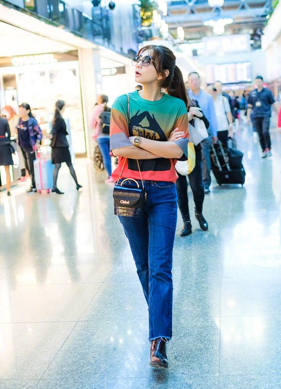 Ella穿着一件彩色的短袖T恤,顏色雖然多,但是卻一點都不雜,藍色、綠色、黃色、紫色都是很清新的顏色,這些顏色都極具清爽的少女感,Ella的“隱齡”技術真的太高了,一點都看不出這是一個已經當媽的人,少女氣息真的太濃郁了