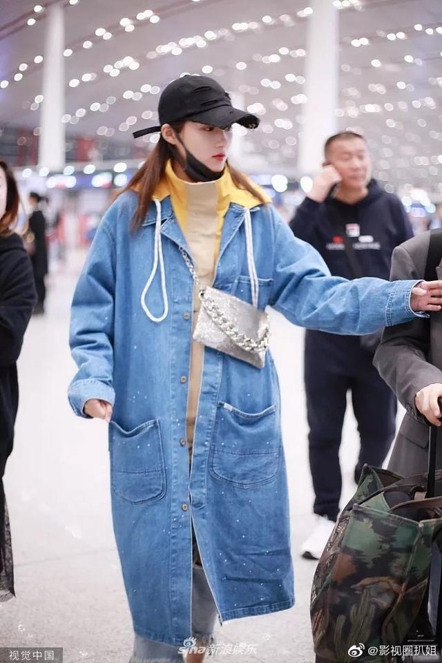 關曉彤機場秀牛仔棉服露出裏面明黃色的帽衫