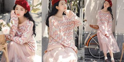 舒適寬鬆的圓領毛衣,下半身搭配一條網紗百褶半身裙,上身有種小慵懶的感覺,衣身撞色拼接圖案,整體的穿搭上下呼應,非常的甜美可人。