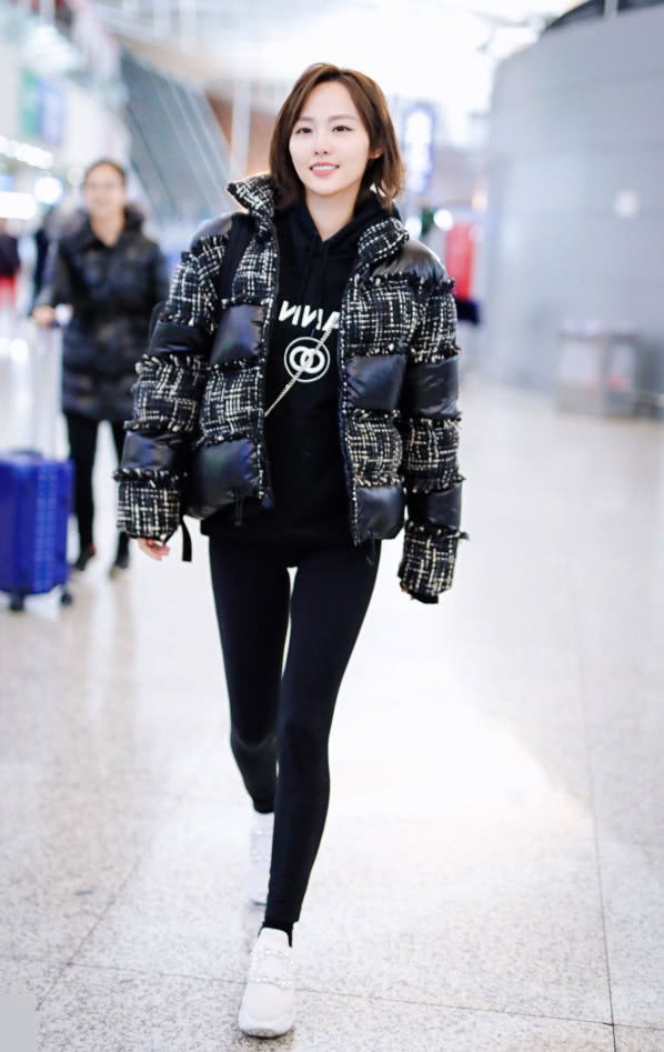 張嘉倪身穿一件黑色的緊身褲,腿部線條很好看,散發出無限魅力,還有幾分時尚感。搭配一雙黑色的襪子,看起來腿部更長。穿小白鞋是落伍的行為,看她的“棉花鞋”吧!