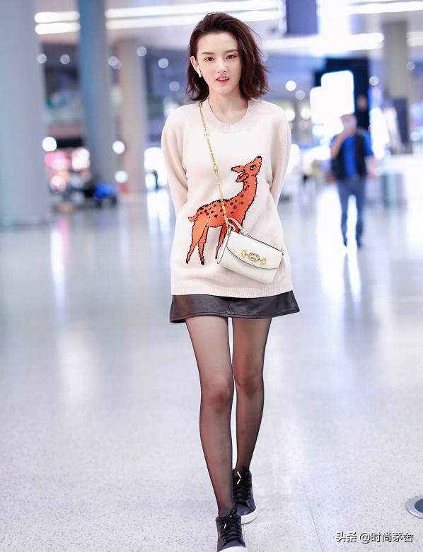 如果是小個子這樣穿,最好還是把毛衣塞到裙腰裡,製造高腰線更加顯高顯瘦,黑色的皮短裙疊穿一條黑色的透肉絲襪以及一雙黑色的帆布鞋,最近娛樂圈似乎特別流行短裙與緊身絲襪或者打底褲的穿法,但是透肉絲襪所給人帶來的感覺是非常性感的,所以宋祖兒這次的機場搭配看起來有小小的小性感,但依舊不失少女的俏皮可愛。