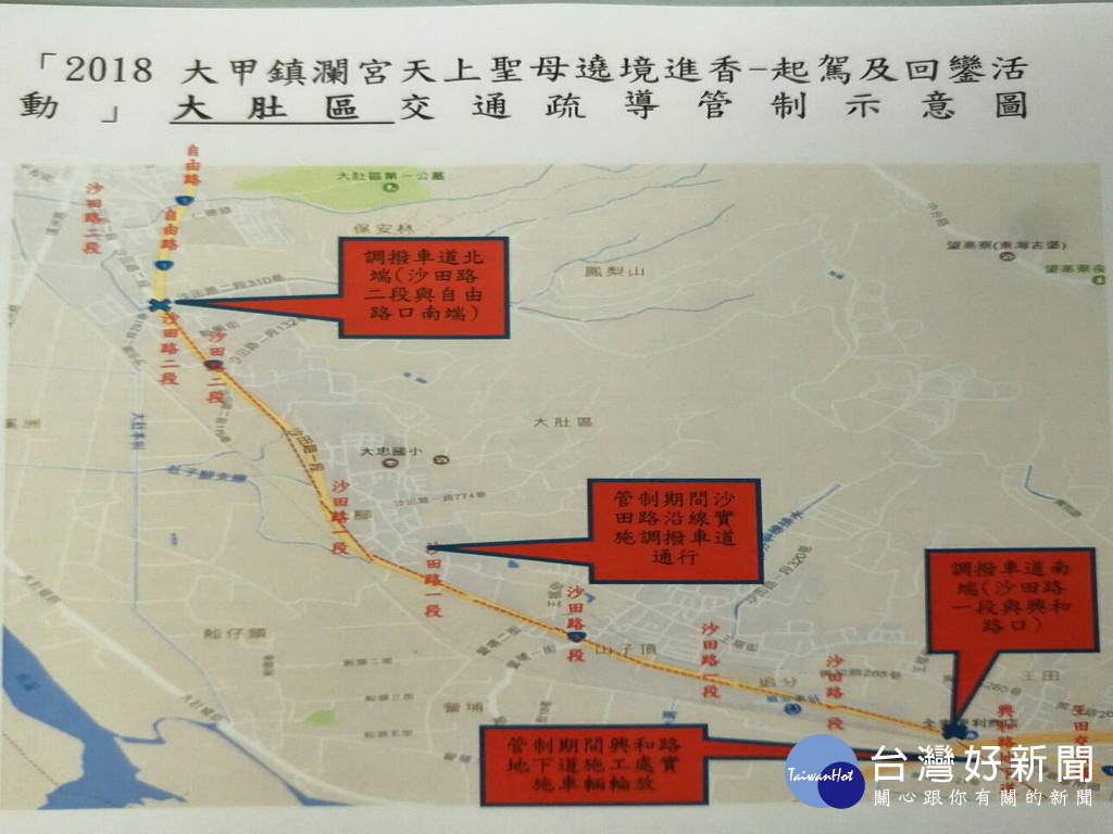 1、大肚區路口管制部分(禁止小客車以上車輛進入大肚市區沙田路二、 三段大甲媽祖遶境沿線):沙田路二段與自由路口南端、自由路與仁德路口、自由路與平和東街口、自由路與文昌路一段口、自由路與自治路口、自由路與華山路口、自由路與萬興路口、沙田路三段與自由路口北端。