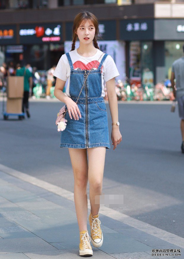 先來看看穿搭上比較保守額小姐姐。上面這個小姐姐是綁了超級少女的兩個辮子,她的臉型也是比較長的,感覺是有點靦腆的小姐姐。一件白色的T恤搭弔帶牛仔裙,一雙黃色的高幫鞋,粉色的包包,露出了自己筆直的雙腿,這樣的穿搭還挺適合夏天的,年齡上沒有太大的限制,偏校園風的穿搭,喜歡的小姐姐可以嘗試一下。