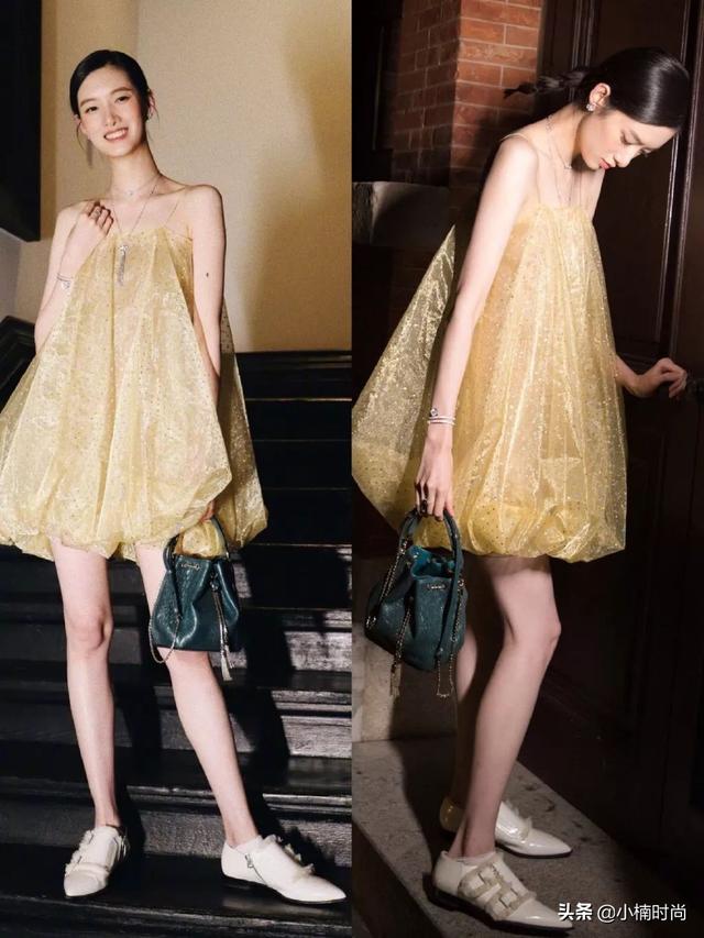 ▲在BvlgariⅩAlexander Wang的派對之夜,Cici受邀出席,身穿黃色的蓬蓬裙驚艷亮相。連身的蓬蓬裙,無腰身,看起來很寬大,也只有Cici這種又瘦又高的身材才能hold得住。弔帶的樣式帶來清爽動人的感覺,而空的脖子處則有放置配飾的地方了,通過疊帶項鏈的方式來做出層次感,一長一短,兼顧到脖子和衣服。裙子是半透明的硬紗材質,既能做出很仙的造型,又讓衣服有硬挺的形在。面料上面綴有一個個的小亮片,隱隱在閃爍着。下身配的是一雙尖頭的皮鞋,簡潔大方,又帶有中性的味道,中和裙子的柔。