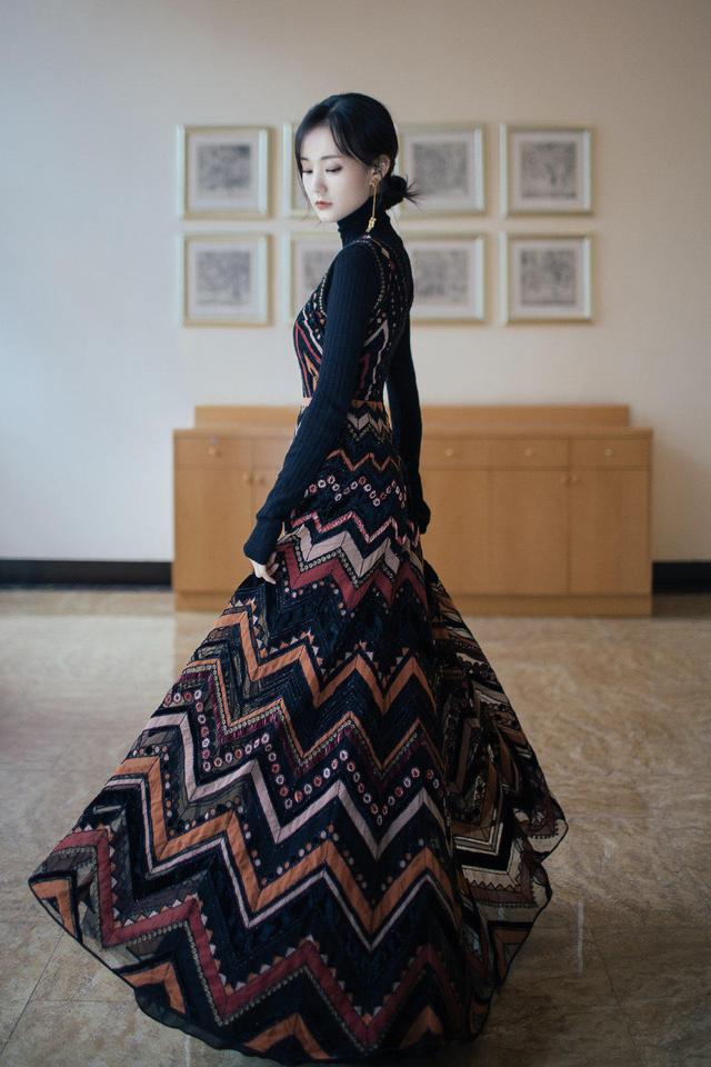 李一桐選擇了一條長款的棕色系連衣裙,這樣的顏色讓她看起來非常的雍容華貴。不規則的圖案設計看起來非常的具有民族風韻,十分具有古典美,在視覺上和黑色非常的和諧。秋冬我們盡量選擇一些偏深色系的顏色,那樣會讓我們女性看起來更加成熟。在圖案的選擇上,盡量以簡單為主,大氣端莊。