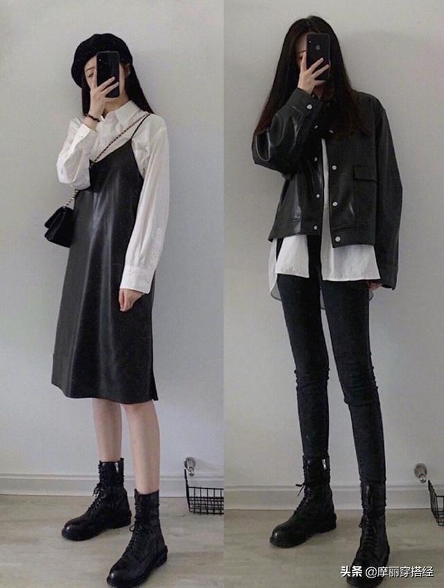 酷女孩依舊可以穿裙子,不過是穿帶有滿分質感的裙子,比如皮質的弔帶裙,性感中又帶有酷勁兒。酷酷的皮衣,疊穿經典的白襯衫,將白襯衫露出一小截,打造出精緻的時尚感與層次感。