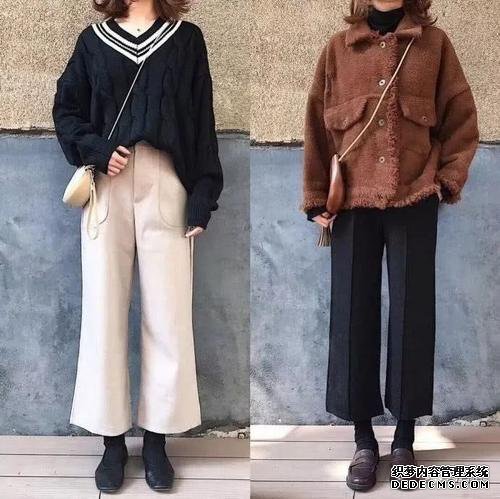 像是經典的學院風的單品就是這種v型領口的針織衫,領口還有着雙豎條線條的裝飾。黑白撞色還有針織成扭曲花紋的紋樣來裝飾,就更顯減齡。短款上衣用來搭配最近很流行的寬鬆版型的設計長褲,這種毛呢材質的長褲在冬天穿就很舒服呢,材質本身有着一定的厚度,而且它的版型還是直筒的,還能夠順便遮住大腿的肉肉顯得小腿很纖細。