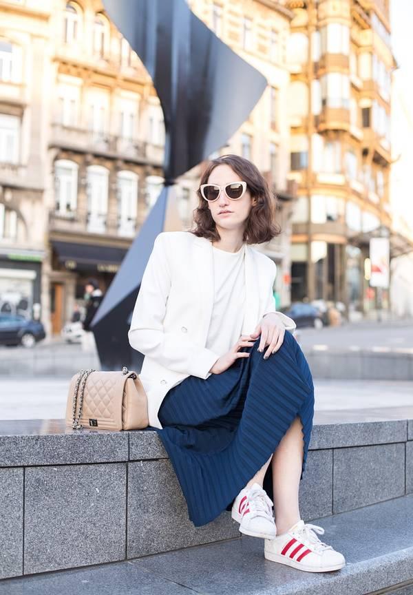黑色的百褶中裙不管搭配運動鞋、平底鞋還是高跟鞋,它都能完美搭配,風格多變,極簡又具運動感。