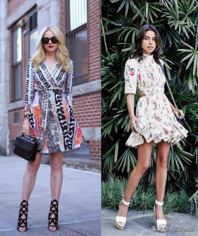 如果擔心造型出錯,不妨學習右邊的look,用同色系穿搭,藍色連衣裙+帶有藍色印花的高跟鞋,顯得清新又迷人。
