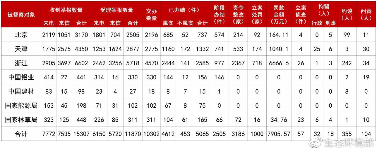 第二輪第二批中央生態環境保護督察邊督邊改情況匯總表 圖片來源:生態環境部官方微博