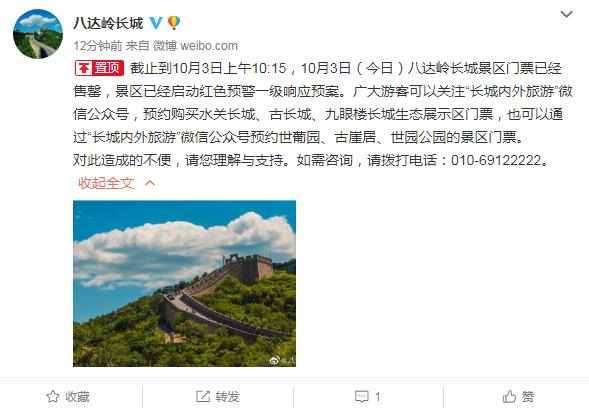 中新網10月3日電 據八達嶺長城風景名勝區官方微博消息,截止到10月3日上午10:15,10月3日(今日)八達嶺長城景區門票已經售罄,景區已經啟動紅色預警一級響應預案。廣大遊客可以關注“長城內外旅遊”微信公眾號,預約購買水關長城、古長城、九眼樓長城生態展示區門票,也可以通過“長城內外旅遊”微信公眾號預約世葡園、古崖居、世園公園的景區門票。