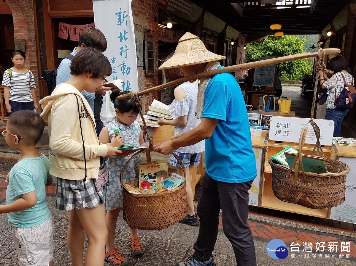 深坑分館主任楊俊生肩挑書香扁擔於老街上漂書,向遊客推薦好書閱讀,借書還可享有深坑美食的消費優惠。(圖/深坑分館提供)