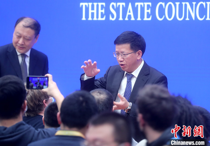 圖為發布會結束后,吳艷華接受媒體追問。 中新社記者 張宇 攝