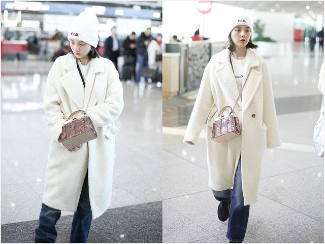 宋祖兒現身機場,白色泰迪熊大衣戴針織帽
