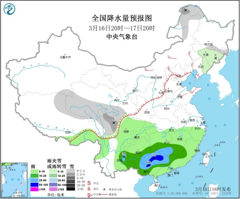 3月16日20時至17日20時,內蒙古東北部、東北地區東南部、青海南部、四川西北部等地部分地區有小到中雪或雨夾雪。江南南部、貴州南部、雲南東南部、華南西部和北部等地部分地區有中到大雨,其中,廣西東北部和中部局地有暴雨(50~70毫米)。內蒙古大部、遼寧、河北北部、山東北部等地部分地區有4~6級(見圖1)。