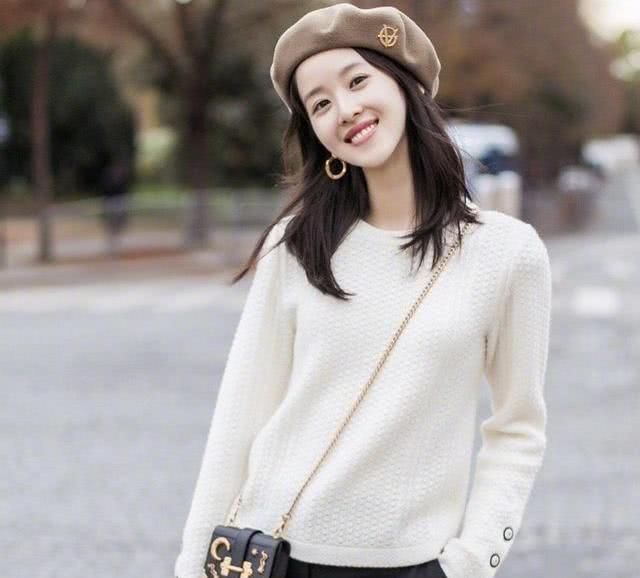 奶茶妹妹好時尚貝雷帽配白色毛衣街拍