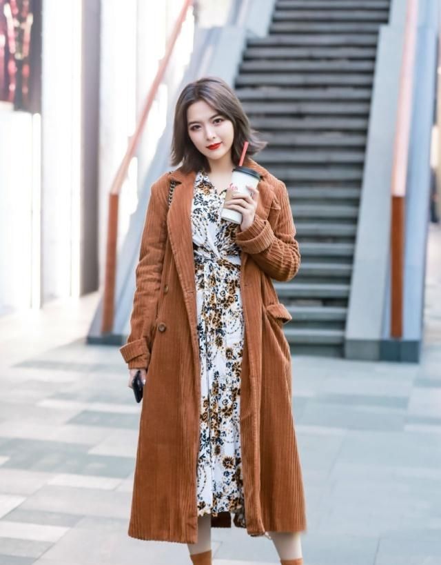 花色鮮亮的連衣長裙,外搭西裝領大衣,很輕鬆的就把顏色鮮亮的裙子包裹了起來,配上和大衣同色調的短靴,外形和氣質顯得優雅且自在。