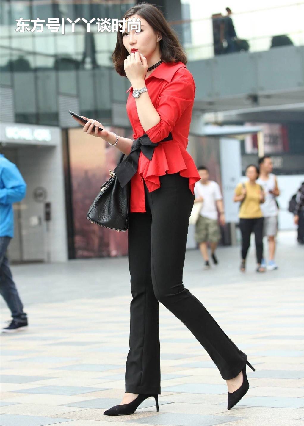 這位女生的上身選擇的是鮮艷的紅色時尚上衣,而下身衣物的選擇則是濃重的黑色緊身喇叭長褲,還有一雙性感十足的黑色高跟單鞋,黑色與紅色的搭配不僅能帶給他人視覺上新鮮感的衝擊,還能凸顯腳的白皙稚嫩,顯得普通而不張揚,低調的奢華尊貴感十足。