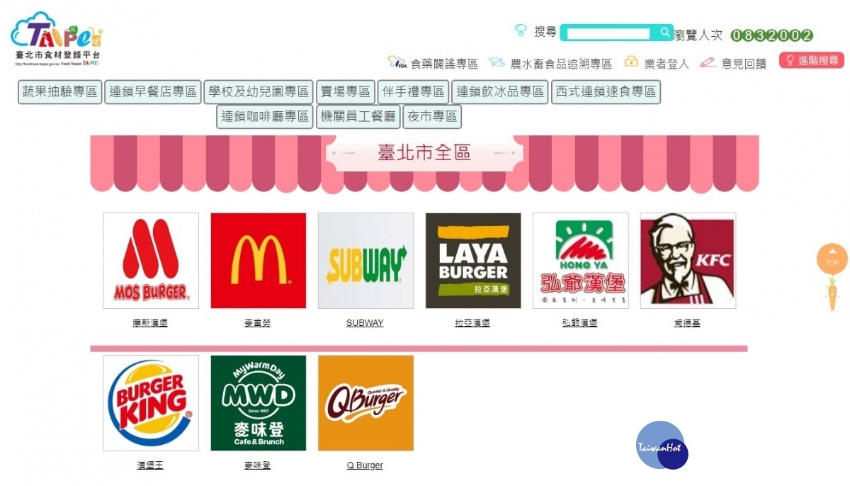 台北市衛生局表示,該局於台北市食材登錄平台首頁增闢「連鎖早餐店專區」,已於今(107)年5月份邀集連鎖早餐店業者辦理說明會,共28人代表22個品牌參加,並透過貼心到點輔導登錄及專人專線服務電話,目前已有Q Burger、SUBWAY、弘爺漢堡、拉亞漢堡、肯德基、麥味登、麥當勞、漢堡王及摩斯漢堡等9家業者自願配合政策先行加入,公布早餐熱量、過敏原、食材及包材來源、自主檢驗報告等。未來北市衛生局也會依據台北市食品安全自治條例第7條規定,公告連鎖及非連鎖早餐店業者應強制加入平台,期透過更多的資訊揭露,給民眾更完整的食安守護。