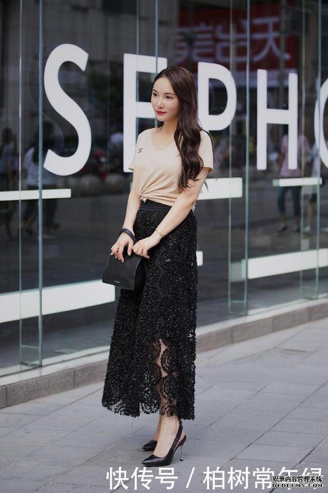 破洞的設計加上細微的流蘇,顯得特別的浪漫,腳上踩着一雙卡其色的高跟鞋,氣質的同時又能夠增加溫柔的氣息。這個春天也要走向了結束,天氣慢慢的熱了起來,小姐姐出街的時候穿着一件藍色的上衣,弔帶的款式拼接有薄紗的設計,看起來帶着一種淡淡的性感而高貴的氣息,下半身搭配上一條黑色的短裙,能夠優雅地展示出她那美麗的雙腿。