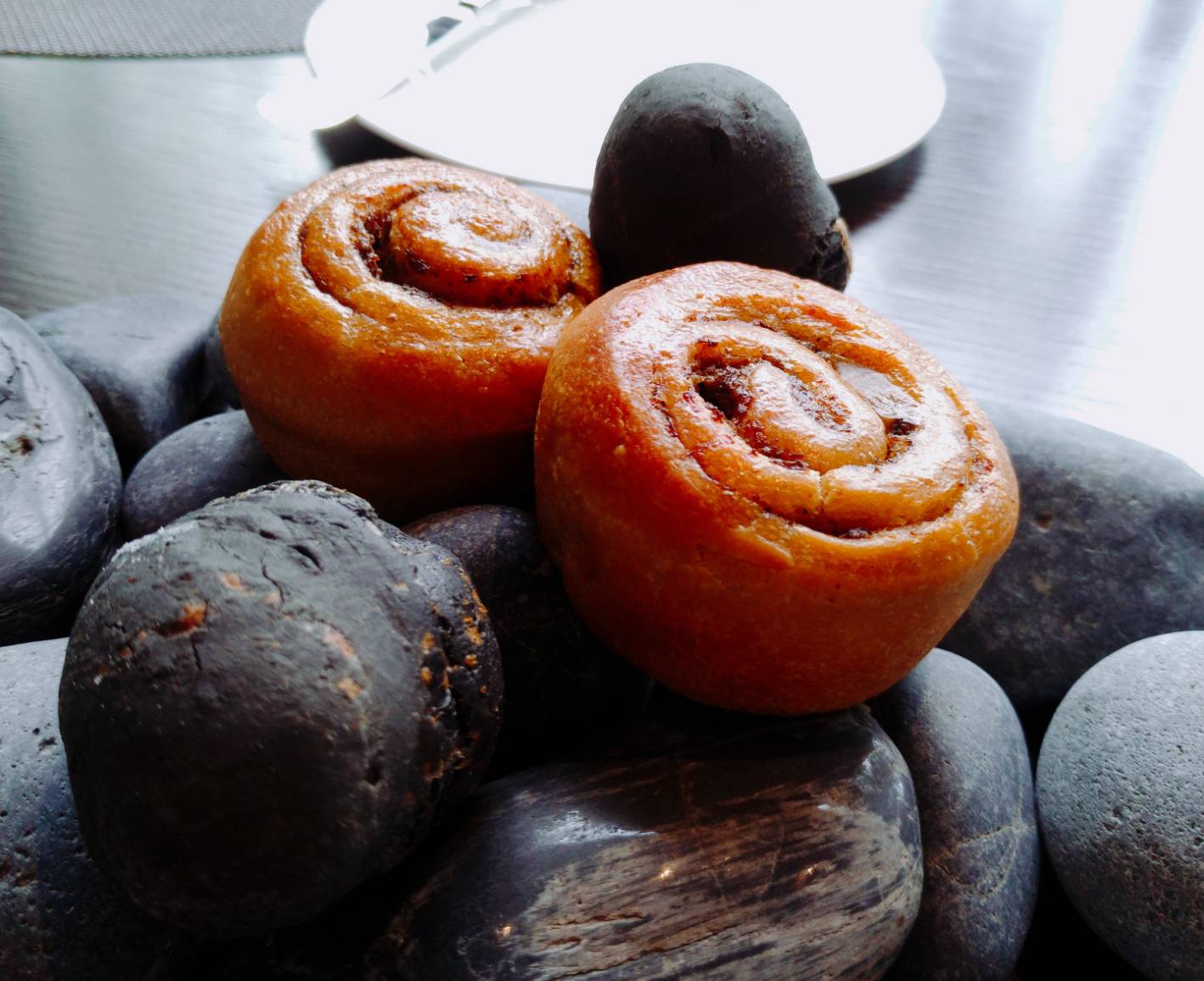 餐前麵包咖啡布里歐麵包及木薯起士麵包。布里歐麵包是法式麵包的經典之一,多里霍斯主廚加入哥倫比亞濃縮咖啡粉,獨特的果酸和堅果香氣在口中擴散;木薯起士麵包則是巴西、哥倫比亞等國家常見的國民小吃,外型有如哥倫比亞原始叢林裡的石頭,內餡灌入以核桃木煙燻的格瑞爾起士,一口咬下,充滿多層次的經典南美洲風味。(葉又齊攝)