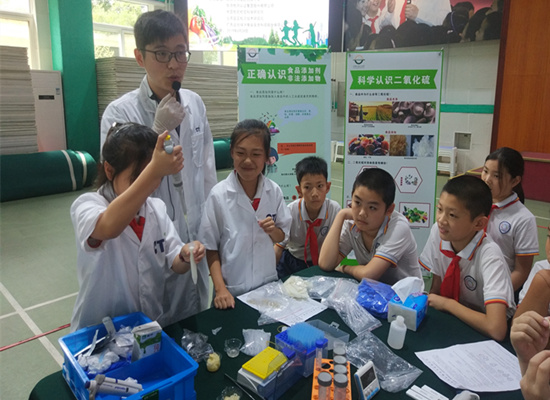 在亞硝酸鹽檢測體驗區,幾名學生在華測檢測認證集團檢測人員的指導下,把少量火腿腸放於試管中,滴入化學試劑。幾分鐘后,學生們就發出“變成紫色了,真的變成紫色了”的叫喊聲。檢測人員表示,為了能起到警示作用,她在實驗前特意往火腿腸中添加了大量亞硝酸鹽,溶液變成紫紅色意味着該樣品的亞硝酸鹽含量已經嚴重超標。她告訴學生們,亞硝酸鹽屬於食品添加劑,有防腐保鮮的作用,常見於火腿腸等肉質加工品,在不影響食品安全的前提下是被允許使用的,但是使用含量必須遵照國家的規定,“除了肉製品,儲存時間長的肉類、菜類也可能會生成亞硝酸鹽,過量攝入的話會引發中毒,嚴重的話甚至有可能致死,所以對於放置時間過長的食物,也一定要引起重視”。