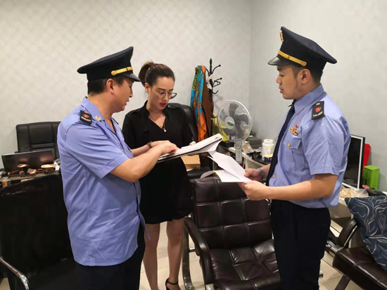 桂林市市場監管局旅遊分局執法人員檢查涉事購物店遊客購物台賬。 陽顯超/攝