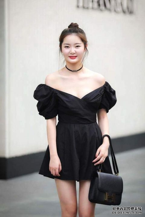 這一身的搭配亮點便是以大開領的一字領露出胸前的一片大好春光,掐腰的設計更為顯瘦,再以黑色的底色連衣裙包裹全身展現出身材線條,盡顯青春的獨特穿搭美感。
